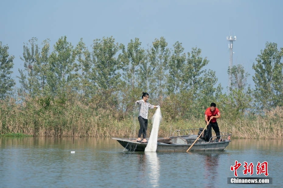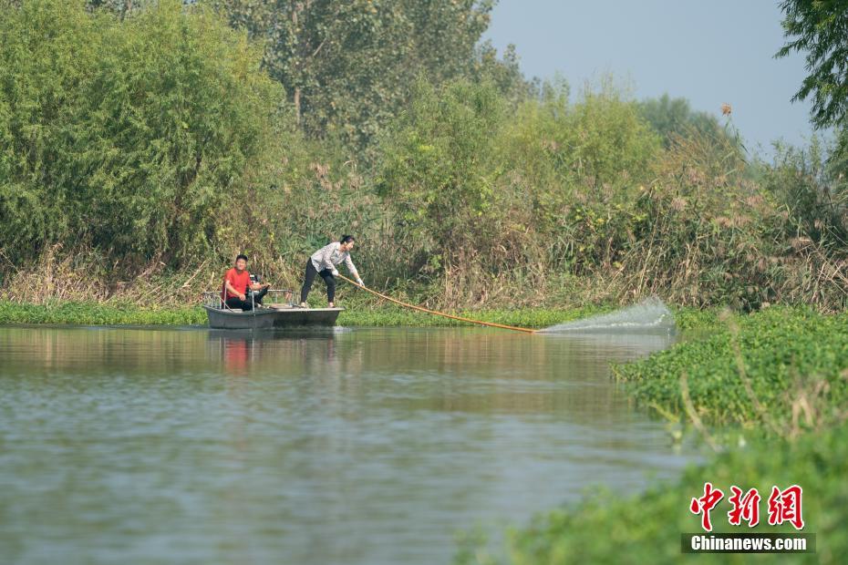 渔民陈恒花在微山湖水域自家的鱼塘捕鱼。史春阳 摄