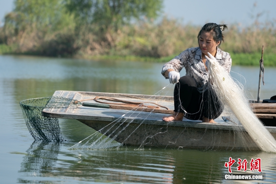 陈恒花在微山湖水域自家的鱼塘捕鱼。史春阳 摄
