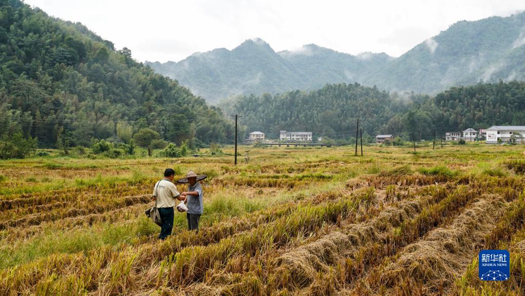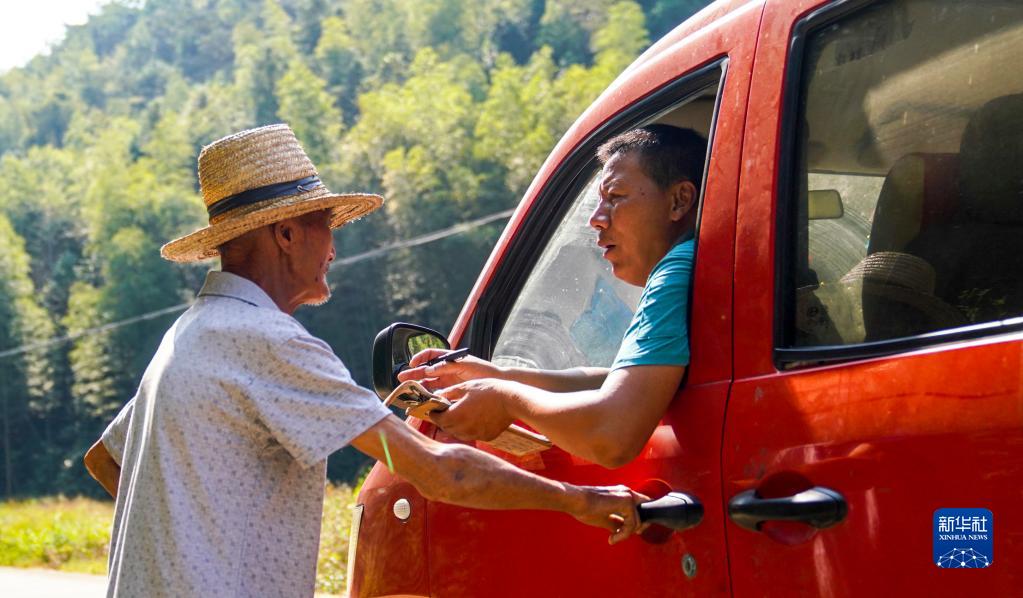 10月6日,双峰邮政所的邮递员吴文清(左)将货物送给一名在田间劳作的村民手中。