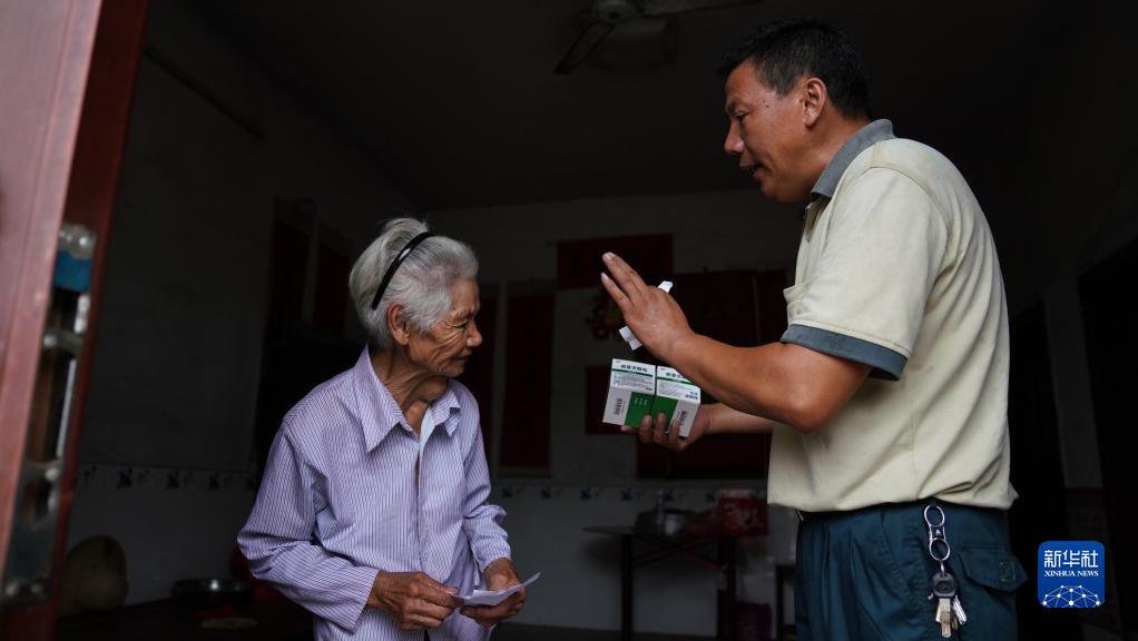 10月6日,双峰邮政所的邮递员吴文清(右)向一名订购药品的村民讲解使用方法。