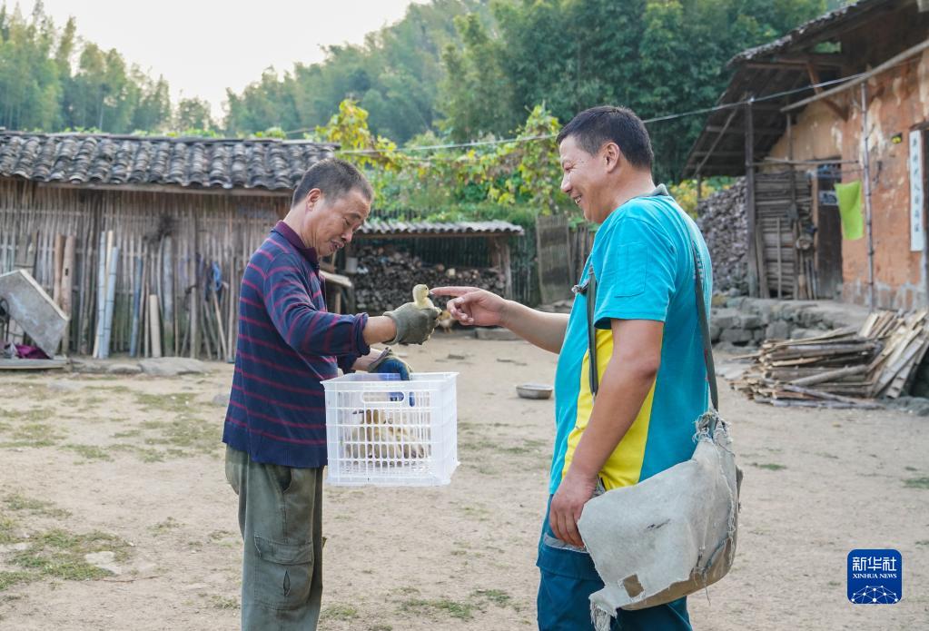 9月28日,双峰邮政所的邮递员吴文清(右)将鸭幼崽送至村民手中。