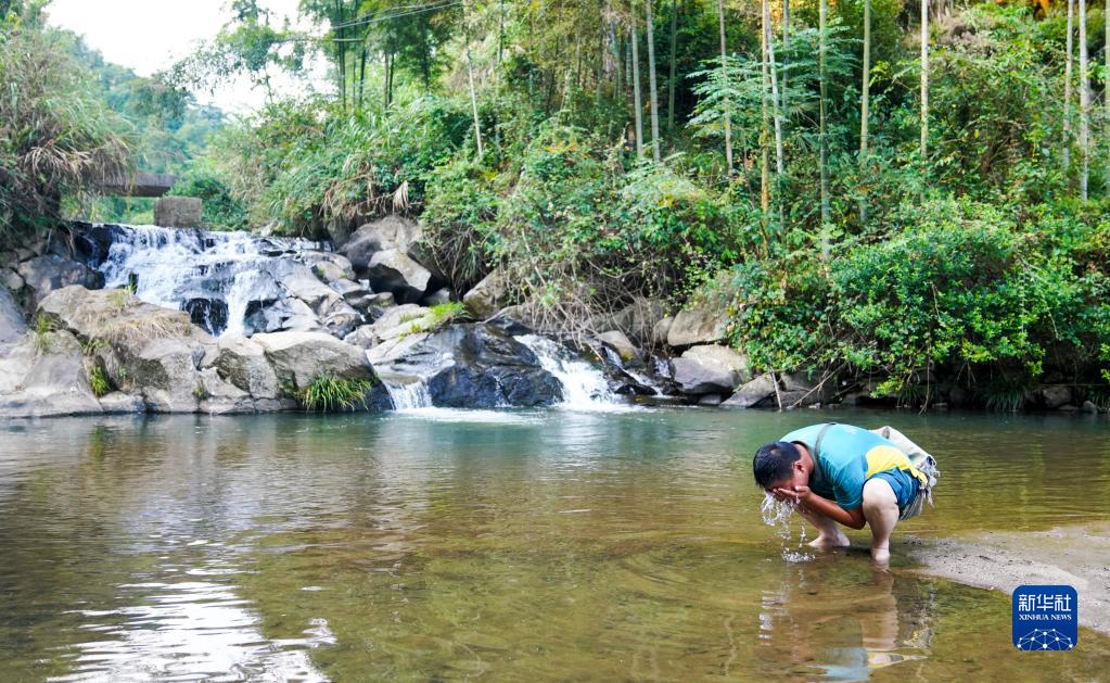 9月28日,送货途中,双峰邮政所的邮递员吴文清用山间的溪水洗脸。