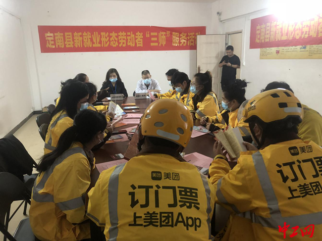 中工网讯为提高新就业形态劳动者的法律、维权、健康意识,近日,江西省赣州市定南县总工会利用“三师一室”平台,组织“三师成员”到新就业形态劳动者外卖送餐员中开展“三师”服务活动。