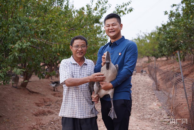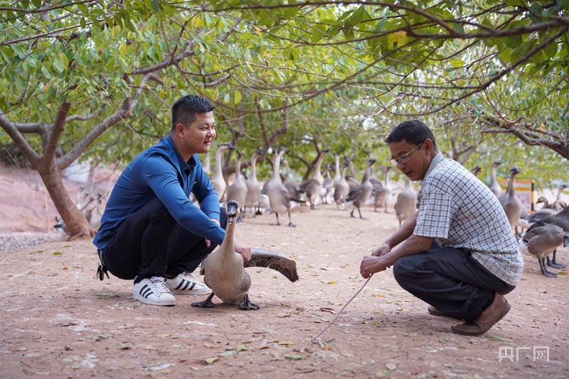 何冰辉与养殖户丁周交流。(央广网记者 官文清摄) 从年养数千只发展到年养近10万只,年收入超过了20万元,看到市场的何冰辉拉动了更多人一起养鹅。