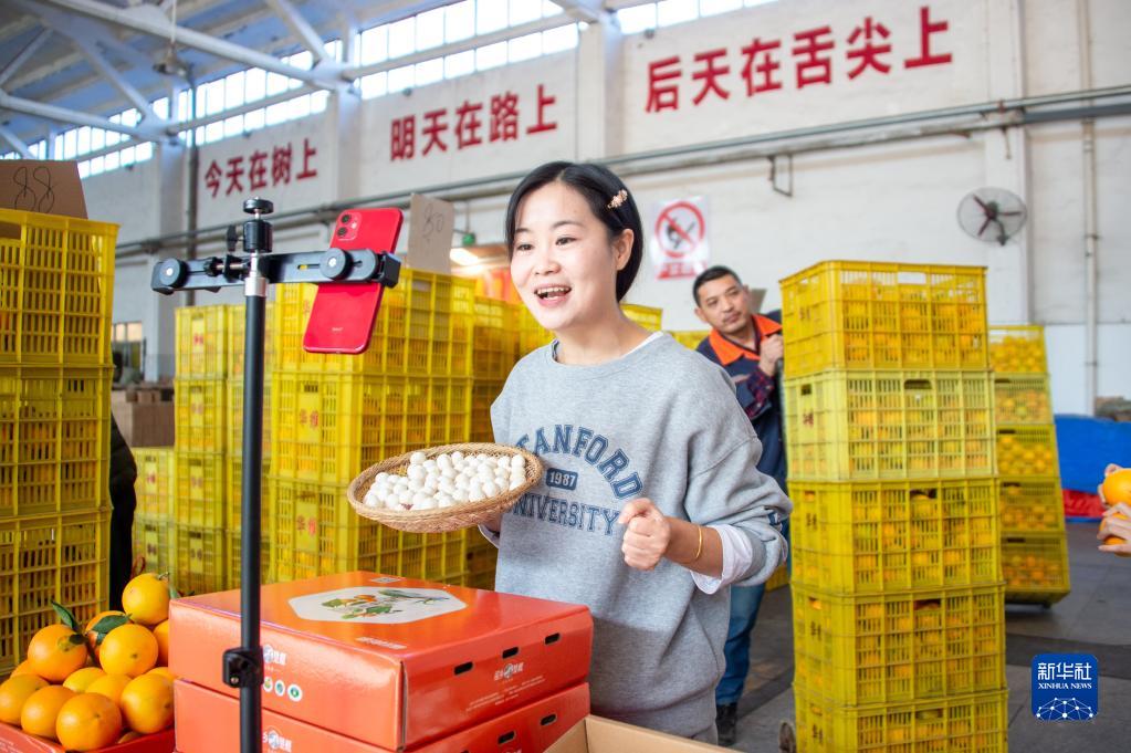 11月10日,在秭归县华维电商物流园区内,工作人员进行直播销售。 作为国家数字乡村试点地区,湖北省秭归县积极推进信息基础设施建设、智慧农业和乡村数字治理,将数字经济与传统农业产业融合发展,推出集智慧生产、智慧营销、智慧供应链于一体的科技农业示范基地及农业信息化综合应用平台,助力乡村振兴。