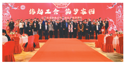中工网讯 据江苏工人报消息,11月10日,由江苏省总工会主办的“缘起工会 筑梦家园”江苏省省部属企业首届职工集体婚礼暨大峘集团第十七届集体婚礼在南京举行,来自省部属企业的20对新人喜结良缘,许下爱的诺言,携手走入婚姻殿堂。4位全国劳模代表分别在现场和线上送来美好祝福。