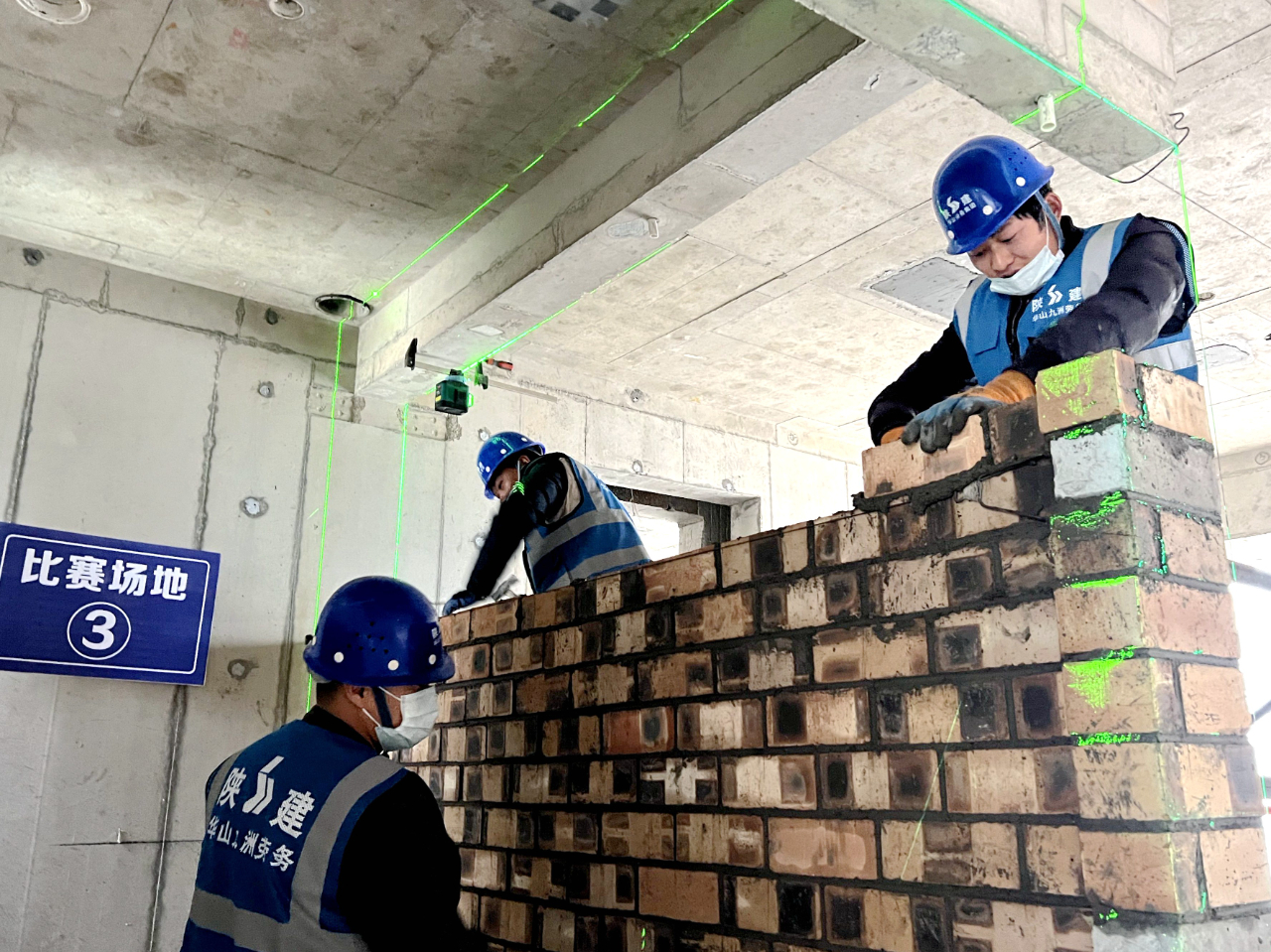 随着裁判员一声令下,各参赛队员迅速投入到紧张的比赛中,测量、挑砖、砌筑、找平、勾缝……刀砌砖垒,一气呵成,方寸之间,毫米必争,选手们有条不紊,运用熟练的砌筑技法,力争在规定时间内高质量完成比赛项目。
