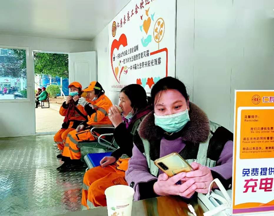 环卫工人刘燕芳和几位同事,打扫完广场上的卫生后,走进站内接了一杯热水。“服务站离我们近,工作间隙来歇会儿,很安逸!”说起这个新设立的户外劳动者服务站,刘燕芳竖起大拇指。