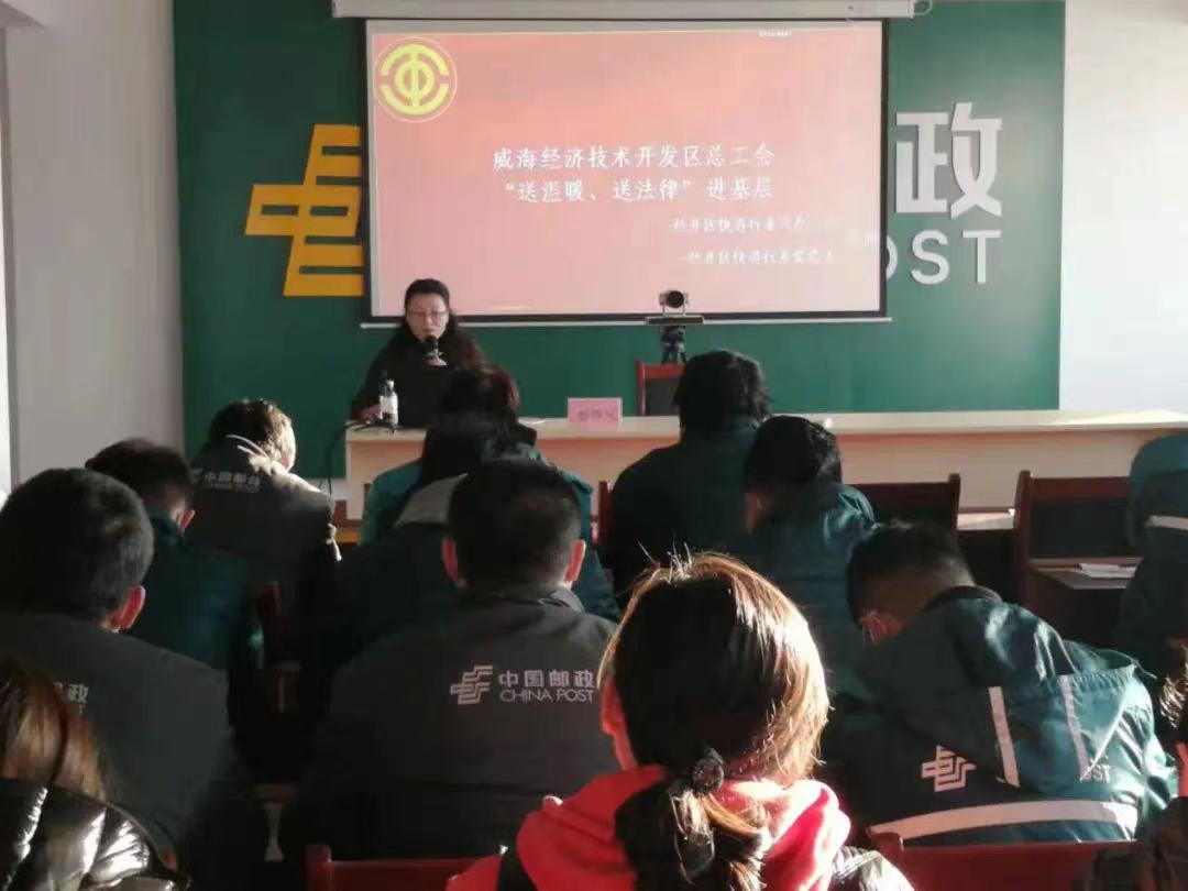 日前,山东威海经济技术开发区总工会开展“送温暖、送法律”关爱新就业形态劳动者专场活动,50余名快递小哥现场感受到了来自“娘家人”的关爱。