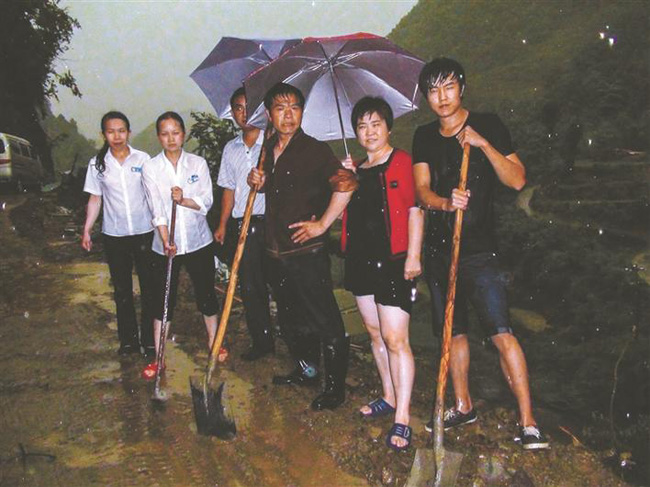 张明富(右三)和梦润集团员工深夜抗洪修路