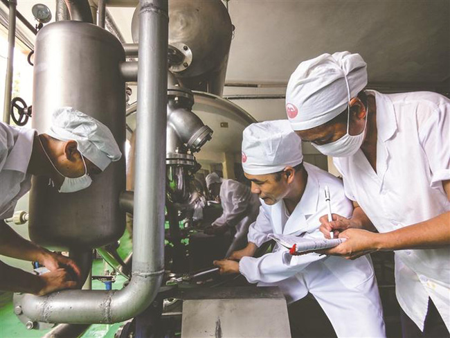 张明富(中)和工人一起检修机器设备