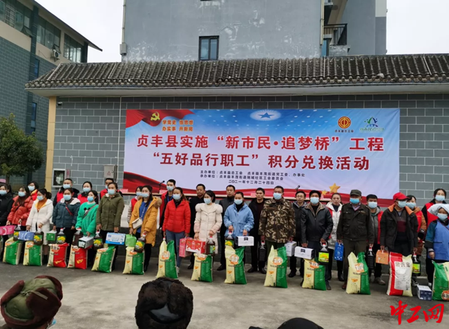元旦前夕,贵州省黔西南州贞丰县总工会在丰茂街道珉城社区开展了第四季度“5好品行职工”获奖群众积分奖励兑现活动。至此,2021年贞丰县总工会“五好品行职工”积分兑换活动圆满落下帷幕。