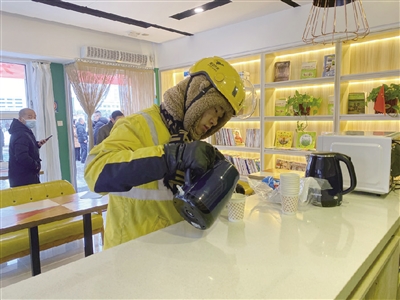 外卖小哥走进青城驿站,倒了一杯热水,准备休息一下继续工作。 1月23日,全市户外劳动者服务站点开放仪式在赛罕区万正广场青城驿站举行。在青城驿站里,记者看见书报阅览区、休闲座椅以及热水壶、微波炉、充电插座等一系列便民设施一应俱全,室内的温度也十分适宜。一位途经驿站的外卖小哥停下车子走进驿站,提起开水壶倒了杯热水,经过短暂休息后又在寒风中继续工作。“设施挺全的,避雨歇脚很合适。”外卖小哥对驿站的暖心设施竖起大拇指。
