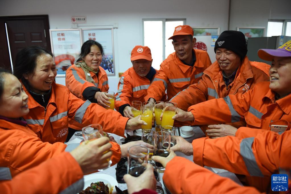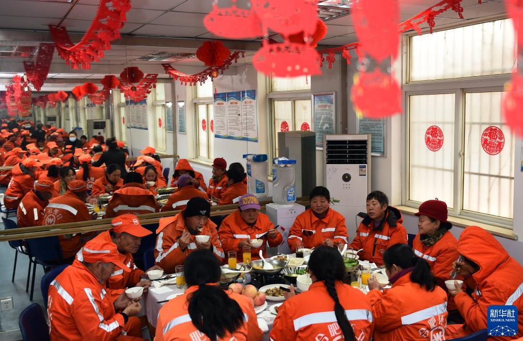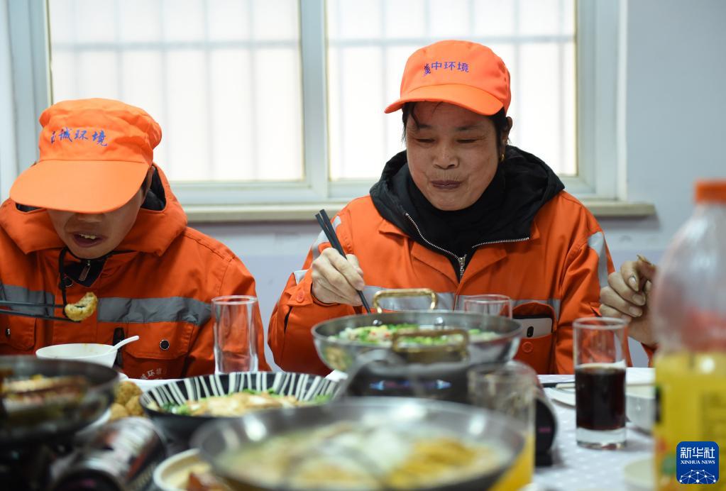 1月24日,环卫工人在合肥市庐阳区龚湾路环卫驿站吃团圆饭。 春节临近,安徽省合肥市庐阳区部分家在外地的环卫工人选择留在合肥就地过年。1月24日中午,庐阳区城管局邀请40余名留守过年的环卫工人一起吃团圆饭提前过年,让他们能安心留守,在异乡也能感受年味。