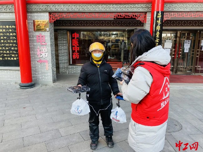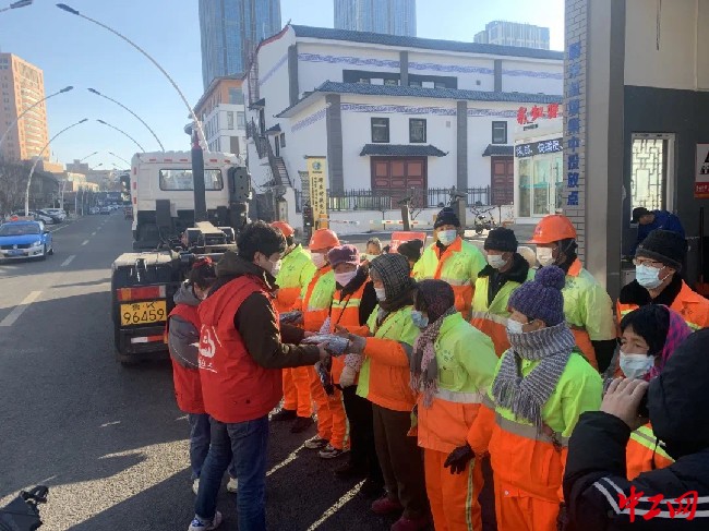 活动中,大家用小推车推着春联、姜茶、手套、护膝等慰问物品,来到附近街道,把这些带着融融暖意的物品送给正在辛勤工作的网约送餐员、环卫工人,为他们送上工会组织的节日问候和祝福。