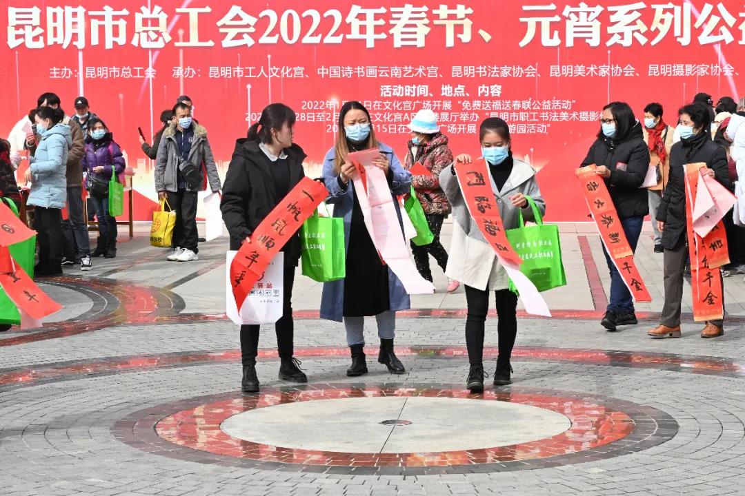 活动现场邀请了书法家和书法爱好者为广大职工群众特别是新就业形态劳动者书写春联和“福”字。各位书法家与书法爱好者在昆明市工人文化宫广场上泼墨创作,一张张洒金红纸相继铺开,苍劲有力的字体、精湛纯熟的笔法,一句句对新年的美好期望和祝福跃然纸上。