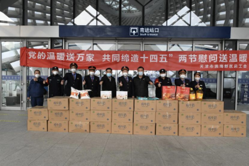 | 近日,天津市滨海新区总工会走访了滨海、滨海西、滨海北高铁站,慰问承担春运任务的一线职工,为他们送上慰问品和新春祝福。滨海新区总工会“党的温暖送万家,共同缔造‘十四五’”2021年冬季送温暖及2022年春节慰问活动就此拉开序幕。 |