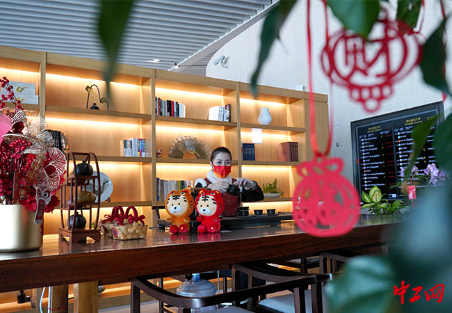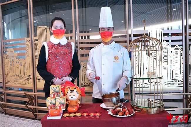 喜迎新春,机场航站楼内围绕中国红主题,摆放灯笼、红包、中国结及喜庆绿植,播放节庆歌曲,开展互动小活动,赠送带有机场和春节元素的伴手礼;部分区域工作人员着红旗袍、唐装、茶服烘托节日氛围。在“同城同质同价”的基础上, 30余个店面,1200余种商品开展春节商业促销活动,以有力度的优惠带给旅客节日途中的小惊喜。