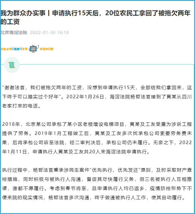“谢谢法官,我们被拖欠两年的工资,没想到申请执行15天,全部给我们拿回来,这下终于可以踏实过个好年”。1月26日,北京海淀法院杨哲法官接到了黄某从四川老家打来的电话。