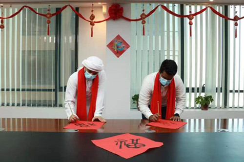 学写对联共庆春节。红纸、黑墨、毛笔、砚台……中国传统文房四宝在桌面一一摆开,中建三局二公司中东办事处外籍们在中籍职工的帮助下,有模有样地描画着一个个“福”字。“在中国,“福”字倒过来是不是表示好运到来?”曾作为优秀外籍员工代表去过中国的Tariq,一语惊到了众人,反应过来的众人大笑不止,大家都纷纷夸赞他是中国通。