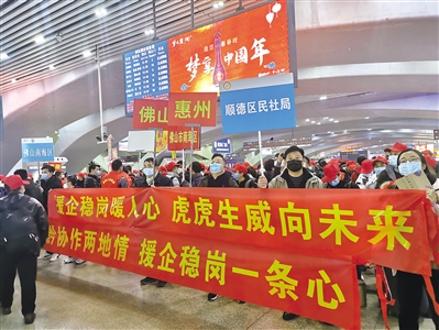 “援企稳岗暖人心,虎虎生威向未来”、“佛黔协作两地情,援企稳岗一条心”、“离开家是追梦人,来中山是一家人”、“东莞有爱,接您上班”……2月9日下午的广州南站,欢迎仪式此起彼伏。