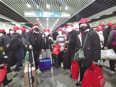 节后返岗高峰,广州南站熙熙攘攘。2月9日下午1点30分左右,载有600名贵州籍务工人员的D2803次列车缓缓驶进月台。头戴红帽、手拎“大礼包”和行李箱的杨先生带着一双儿女和侄子侄媳走下列车后,就被前来接站的工作人员指引着出站,虽然天气微寒,但到处洋溢着的欢迎词和红色横幅让他们感受到了广东人民的热情与温暖。出站后,杨先生与其他的贵州籍务工人员一样,带着憧憬与希望,前往广州、深圳、佛山、东莞、惠州等地,“点对点”返回所在企业,开始新一年的工作和生活。而这趟列车的到达,全面拉开了省际协作组织异地务工人员节后有序返粤返岗的序幕。