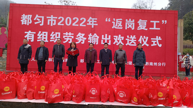 2月16日,贵州省黔南州都匀市举行2022年有组织劳务输出欢送仪式。上午10点,6辆满载都匀籍外出务工人员的返岗专车及50余名自家车主启程奔赴广东、浙江等地返岗。