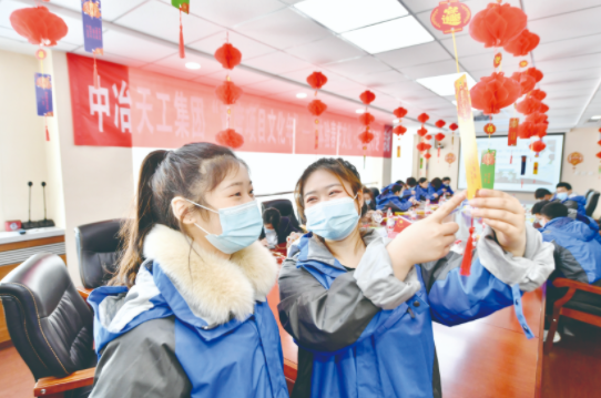 中冶天工集团开展猜灯谜活动。 元宵节当日,中国一冶天津公司东丽湖管廊项目部内,青年职工们在厨师的带领下开始动手制作元宵。大家一起揉粉、调馅、包元宵,分工明确,互相配合。在欢乐的气氛中,一个个形状各异的汤圆新鲜“出炉”。大家看着自己团出来的元宵每个人的脸上都洋溢着幸福的笑容。本次活动以传统节日为载体,营造浓厚节日氛围,传递温暖,让施工在外的职工有了家的感觉。