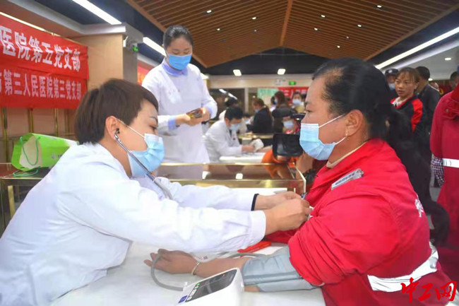 在活动室,第三人民医院医护人员为贵安新区300余名一线职工提供健康保健知识咨询和医疗检查诊断、免费测量血压、血糖等医疗服务,并针对每个职工的情况给予专业的建议和指导,刮痧、拔罐等保健项目,深受女职工欢迎。