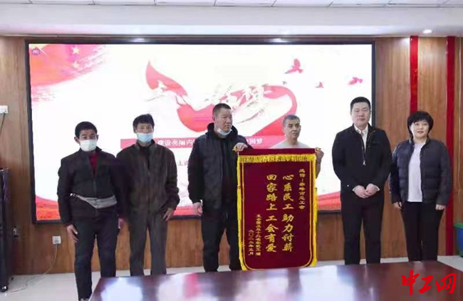 中工网讯 3月9日,3名农民工代表将印有“心系民工 助力讨薪 回家路上 工会有爱”字样的锦旗送到内蒙古赤峰市总工会,并激动的握着工作人员的手说:“是你们及时出面与老板、上级主管部门沟通协商,才让我们拿到了拖欠的血汗钱,让我们心里多一份踏实和温暖,让我们可以回家过年,与家人团聚,感谢你们,感谢工会组织!”