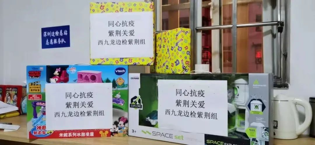 在入户核查的过程中,有队员了解到,其中一位居民家里的小孩还在生病,因为被隔离在家再加上生病的困扰,孩子的情绪十分不稳定,时常哭闹。为了安抚孩子情绪,顺利度过隔离生活,前来支援抗疫的西九龙边检站民警们特意想方设法给孩子送来了玩具。