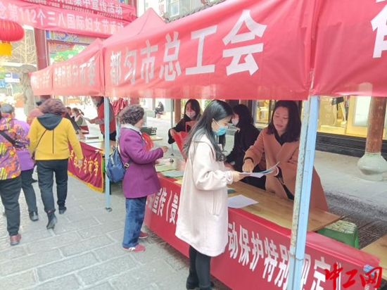都匀市总工会在都匀市石板街开展主题为“贯彻落实《中国妇女发展纲要(2021-2030年)》全面维护女职工合法权益和特殊利益”宣传教育活动。向过往职工群众发放《中国妇女发展纲要(2021-2030年)》《贵州省女职工劳动保护特别规定》《妇女权益保护法》等相关法律宣传资料,并向前来咨询的职工群众讲解如何依法维护自身的合法权益和特殊利益。