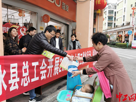 惠水县总工会组织干部职工到惠水县城商贸街开展“三·八”巾帼维权月志愿服务宣传活动。重点对《特别规定》进行宣传。通过发放宣传单、劳动者维权折页、工作人员现场讲解等多种方式,深入开展妇女维权及防艾禁毒等法制宣传教育。向广大群众发放《工会法》《法律援助法》《贵州省女职工劳动保护特别规定》《妇女权益保障法》等宣传资料500余份,并向广大职工群众提供法律咨询服务。