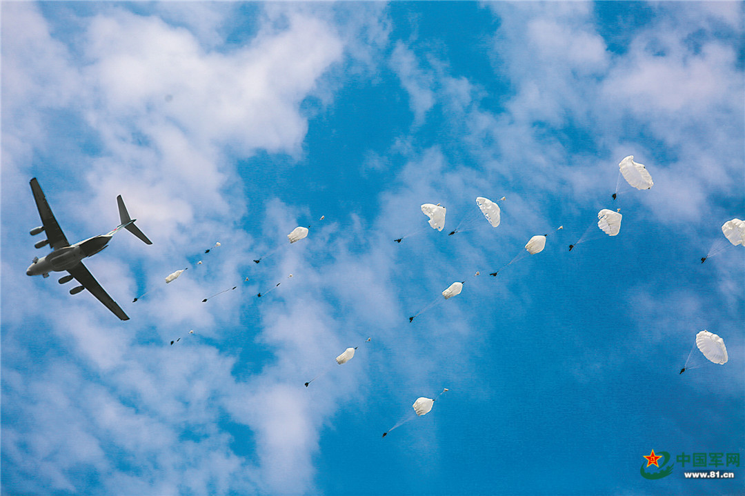 机舱门打开,空军空降兵某旅官兵依次跃出机舱。鲍振宇摄 从凌晨到午夜,空地一体后装保障行动精彩上演——