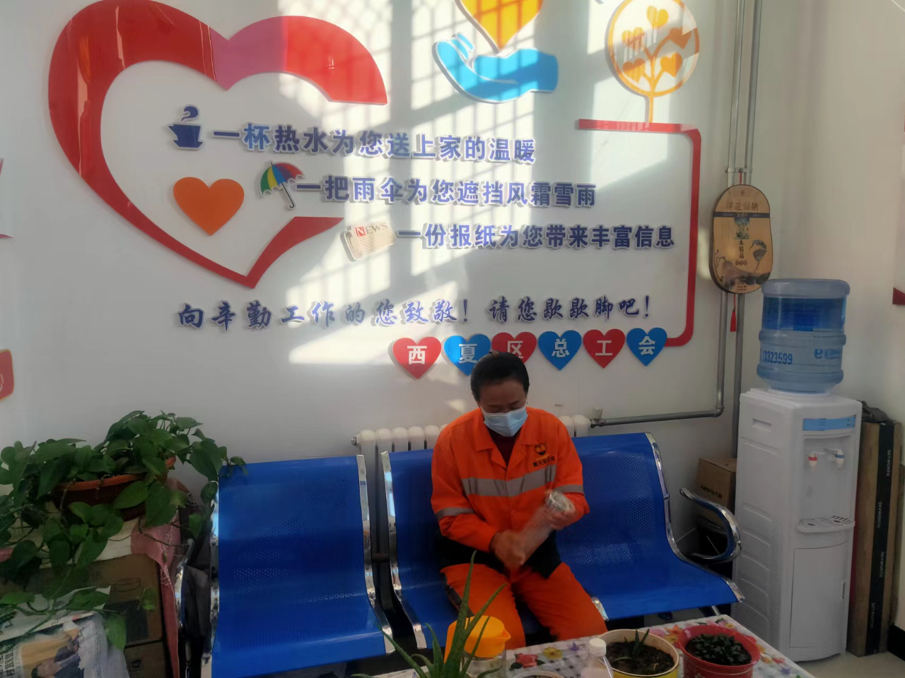 4月11日上午,环卫工老刘完成了管段清扫任务后,来到了位于银川市西夏区星光巷的工会户外劳动者服务站休息。“现在真是太方便了,差不多要啥有啥”,老刘用刷鞋机刷了刷鞋,给手机充上电,又倒了杯热水,打开电视看起来。这样的户外服务站在西夏区还有若干家,自几年前开始建设以来,宁夏银川市西夏区总工会充分利用辖区资源优势,不断调动各级工会、环卫站点、社区和辖区企业积极性,逐渐探索“工会+环卫+社区+企业”共建共享模式,在人流聚集区联合打造户外劳动者服务(法律援助)站,形成了15分钟职工服务圈,为广大户外劳动者提供了极大的便利。
