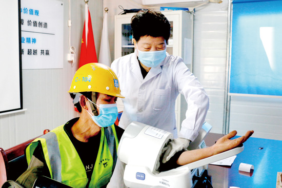 医生为农民工量血压 除了体检大巴,区总工会工作人员和天津市职工医院的医生们还临时把建筑工地的办公室和5间职工宿舍改造成了“体检中心”,只用了十几分钟各种设备就布置完毕,医生们分成多个工作组为农民工提供查体服务。