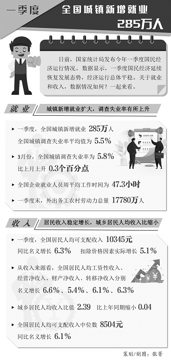 一季度全国城镇新增就业285万人