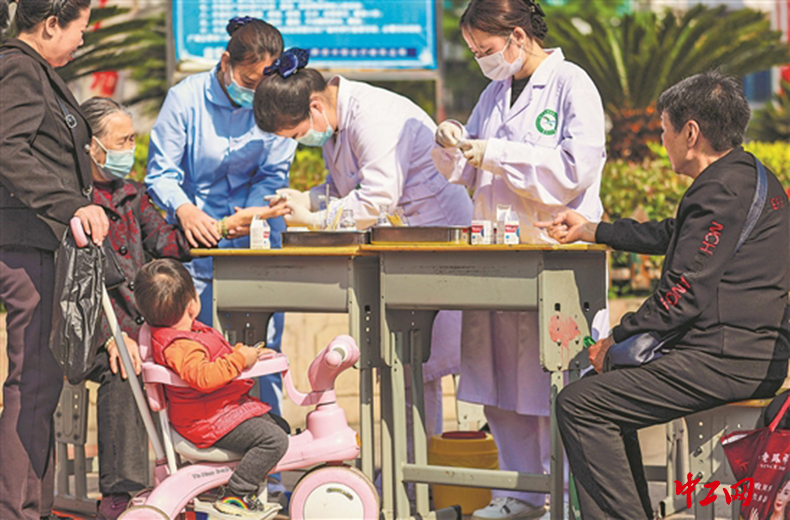 5月8日,贵州省黔西市中等职业学校学生在黔西市水西街道水西社区水西广场给群众测血糖。