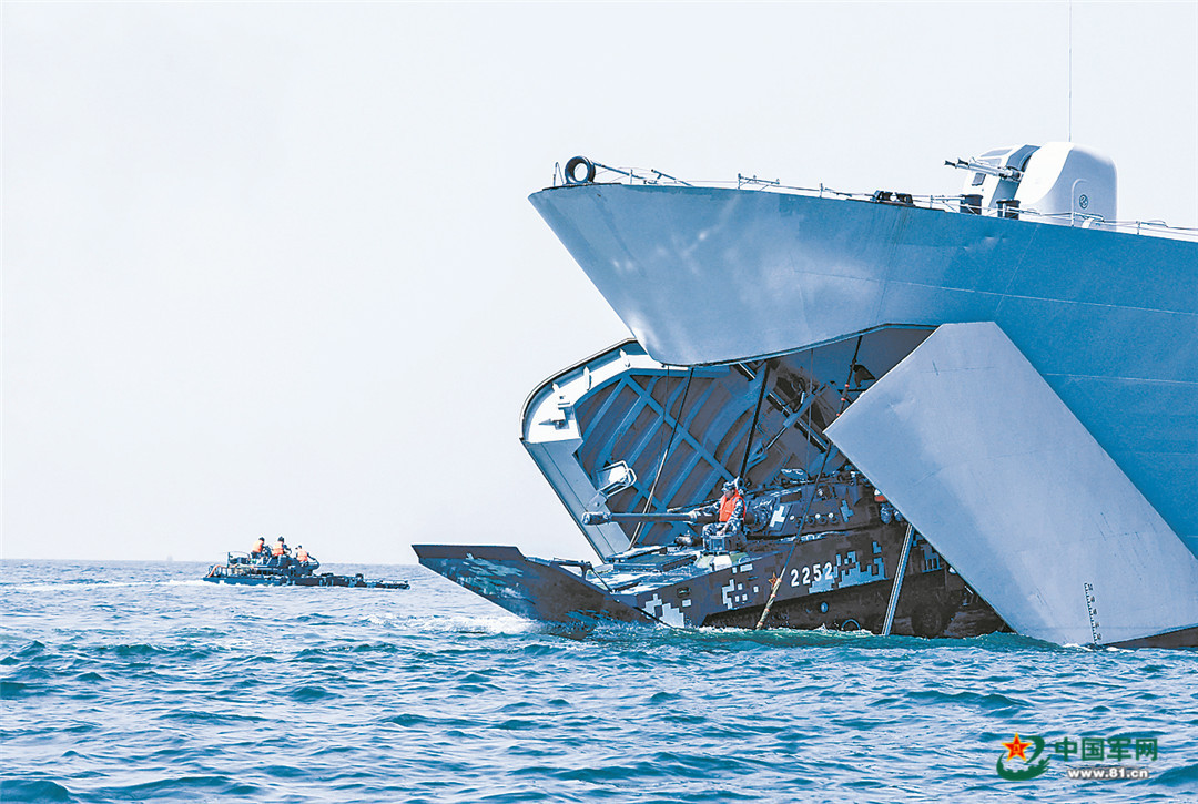 两栖装甲车出舱泛水。 开展浮渡装载训练。 两栖装甲车快速抵滩。