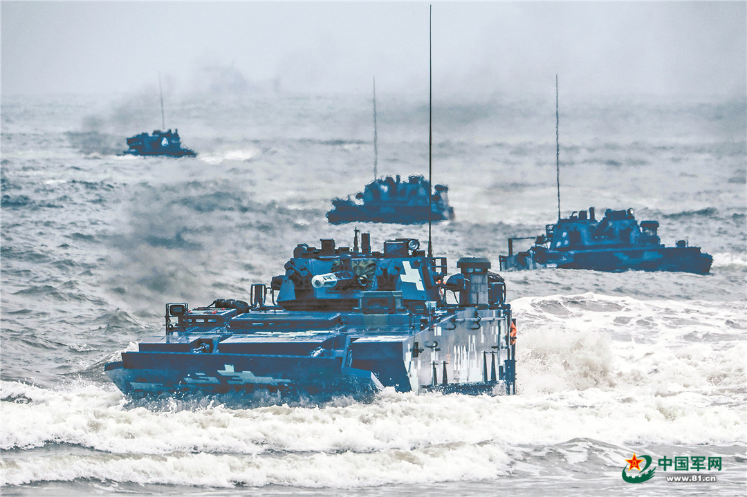 “我车泛水前准备完毕!”接到行动命令后,两栖装甲分队迅速组成战斗编波队形,向岸滩发起冲击。与此同时,搭载两栖装甲车和陆战队员的气垫艇正高速航渡。随着泛水编队和气垫艇相继抵滩,装甲车掩护步兵迅速抢占滩头有利阵地,向目标纵深地域发起攻击。