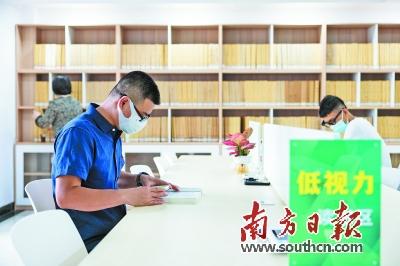 在基地七楼的广东省残联盲文图书馆,盲人按摩师陈锋正在阅读《盲人医疗按摩职业诊疗规范》。他告诉笔者,借助手持助视器放大书本上的文字,仅有右眼0.02视力的他也能看纸质书了。“这里不仅有免费书籍,还有各种各样的辅助设备可以选择。我只要有时间就会来看书。”