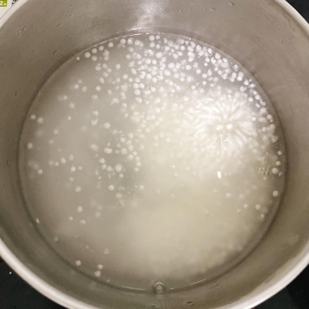水开后倒入西米,煮15~20分钟。建议水量稍微多一些,然后煮的过程中要时刻关注,用勺子搅拌,防止粘锅底。
