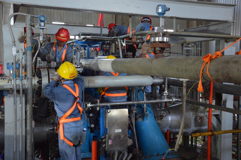 维保分厂全体员工在热浪如蒸的厂房内,时而穿梭于脚手架间,时而聚集于转抽处,时而三两言语谈论,时而众人齐力拆吊,任汗雨横流、湿衣裹身。他们轮班上岗,严格按照检修规程对压缩机进行拆解检查,小心翼翼的拆除后编号摆放,保留照片资料,确保后序安装正确。