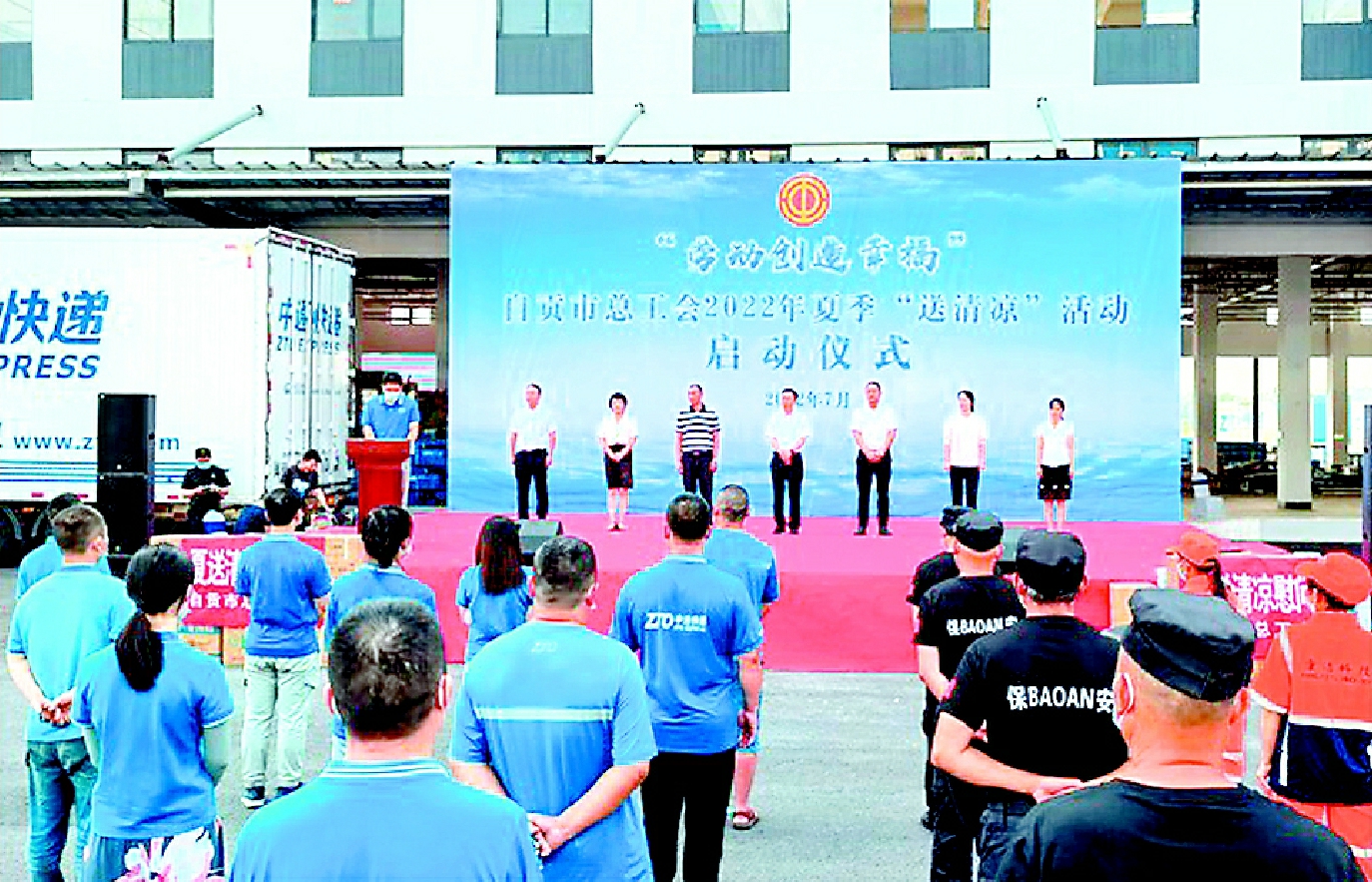 7月8日,自贡市总工会2022年“夏送清凉”活动启动仪式在自贡中竞物流有限公司举行,市总工会负责人带队为100名工作在高温一线的新就业形态劳动者发放防暑降温药品,并向全市奋战在酷暑中的广大职工致以崇高的敬意和亲切的慰问。