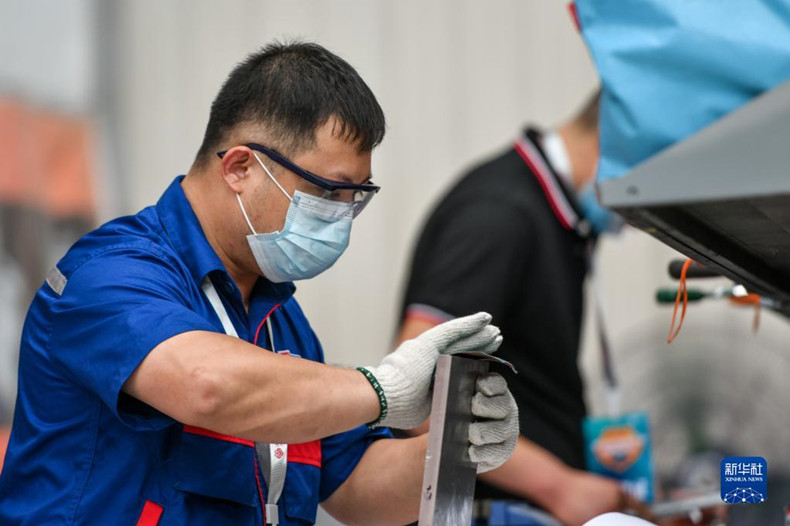7月16日,裁判员(右)在检验竞赛作品。