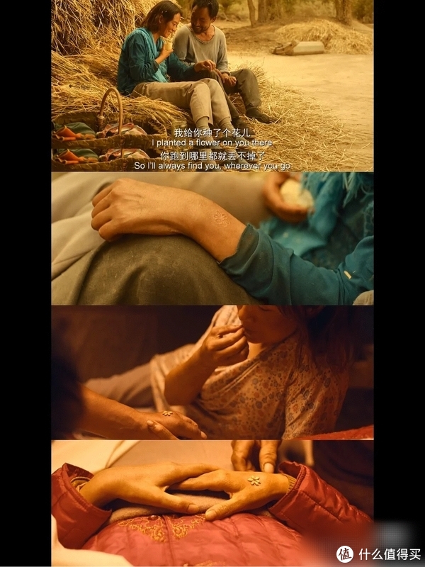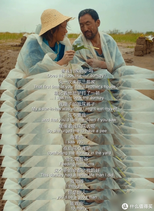 虽然他们也会闹别扭,但总是哄几句就好了,没有那么多的吵吵闹闹、轰轰烈烈。他们两个人从不在意别人的眼光,每天都努力地干活,终于他们有了自己的家,只属于他们家,那么宽敝那么明亮是他们一砖一瓦砌出来的,墙上的喜字工整又显眼,是他们幸福的象征,他们就像麦子一样顽强地生长着,期待着春天,又向往秋天的丰收。在那平凡又普通的日子里,还有属于他们的私人浪漫,麦子六粒印在对方的手上又成了花,草在手里编成了驴,他们之间的爱情是那么的纯粹。