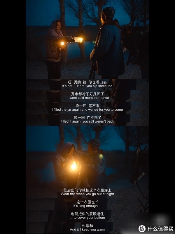 有铁和贵英的爱是惺惺相惜,是细节满满,是在寒冷的冬天互相取暖。有铁本分老实,别人叫他做事,他很少拒绝,村里的人总是背后嘲笑他俩,但他依然会为了那些村里的农民能拿到地租和工资而去无偿献血,会一天一夜地牵着驴帮三哥拉他儿子的家具;贵英患有残疾,跛脚,大小便失禁,且没有生育能力,但有铁从未对她有过嫌弃,她也会在寒冷的冬夜打着电简抱着换了一次又一次热水的水壶在村头等他,会在他献血时满脸担忧地直喊“抽我的吧,抽我的吧,别抽他的了......”。有铁会拿着仅有的钱给她买换季的衣服,会在即便受到了邻居嘲讽他买不起电视时,他也只是不好意思地摸摸脸却没有离开,因为他知道贵英爱看电视,于是某天晚上对贵英说,等收了玉米,就给贵英买个电视。