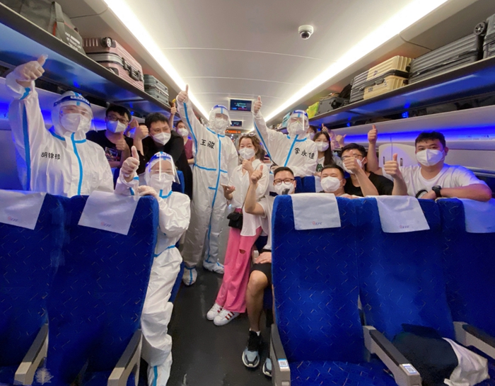 贵阳客运段动车一队、动车五队成立了党团员服务队临时班组,党员列车长朱孟、赵慧敏,入党积极分子张静、李永佳前一晚刚退乘又主动请缨值乘。两趟列车值乘的24名工作人员,出乘前测量体温、做核酸检测,穿戴好防护服、佩戴好N95口罩、手套、面屏等三件套,精神抖擞地有序迎接引导医护人员乘车,协助他们搬运行李及医疗物资、定位摆放,途中加强对列车重点部位的消杀工作。班组提供送水到座服务的同时,还配备了“列车暖心包”,内置一次性雨衣、手机充电线、卫生用品、消毒湿巾等小物件,及时给有需求的医护人员提供相应的暖心服务。C5952次列车上,朱孟与医护人员合唱了一首《孤勇者》,坚定了大家抗疫早日凯旋的决心。