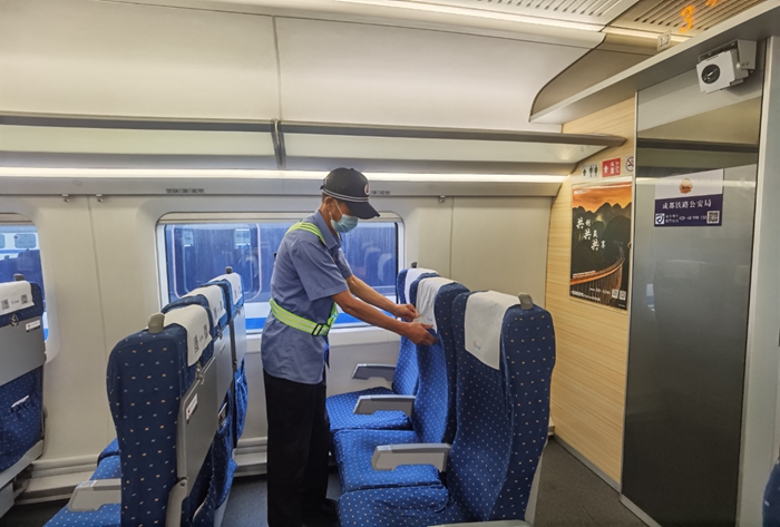 当天下午13时许,中国铁路成都局集团公司贵阳客运段接到上级指示,紧急对6组库停“复兴号”动车组按标进行整备作业。该段整备二车间在岗的13名干部职工闻令而动,细化为消毒、保洁、质检和备品组四个小组,按照分工,对即将出征的动车组进行了深度整备作业。贵阳铁路疾控中心工作人员对车辆进行了消毒喷洒作业,贵阳车辆段贵阳北动车运用所对列车设备设施进行检修整备,逐一排除安全隐患。在4个小时内,质量良好地完成了所有整备作业,为值乘担当打下坚实基础。