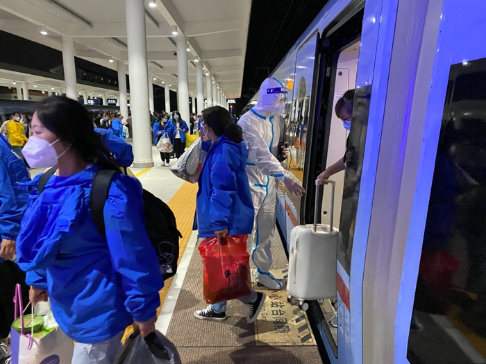 当晚22时,毕节站,C5952次、C5956次列车运送的2000名医疗队员全体安全下车集结。列车工作人员列队向他们挥手道别,期待早日见面接大家回家。 |